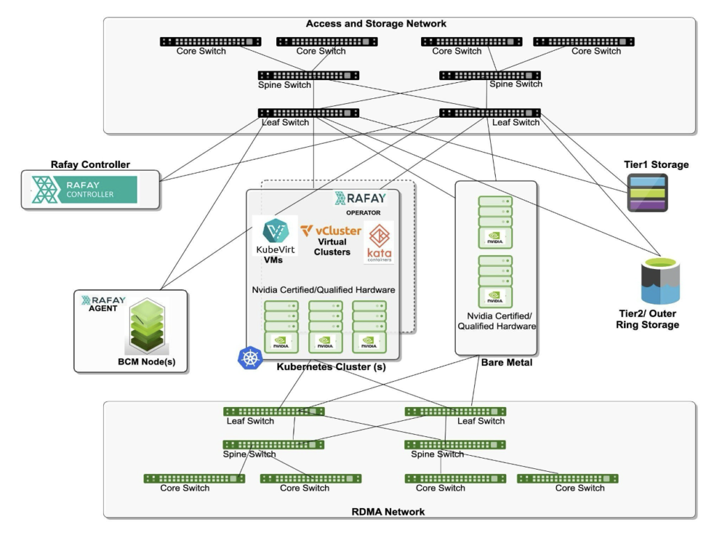 This High-Level Design diagram illustrates an AI/HPC infrastructure architecture built with NVIDIA-certified hardware, Rafay Kubernetes automation, and multi-tiered storage.